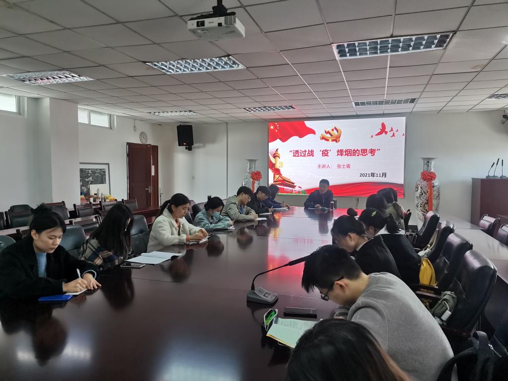 近期国内疫情反复,为增强疫情防控意识,深化抗疫经验反思,学习抗疫奋斗精神,11月11日,金融学院党委副书记张士青在德经楼508会议室给金融工程党支部全体党员讲授“透过战‘疫’烽烟的思考”主题党课。