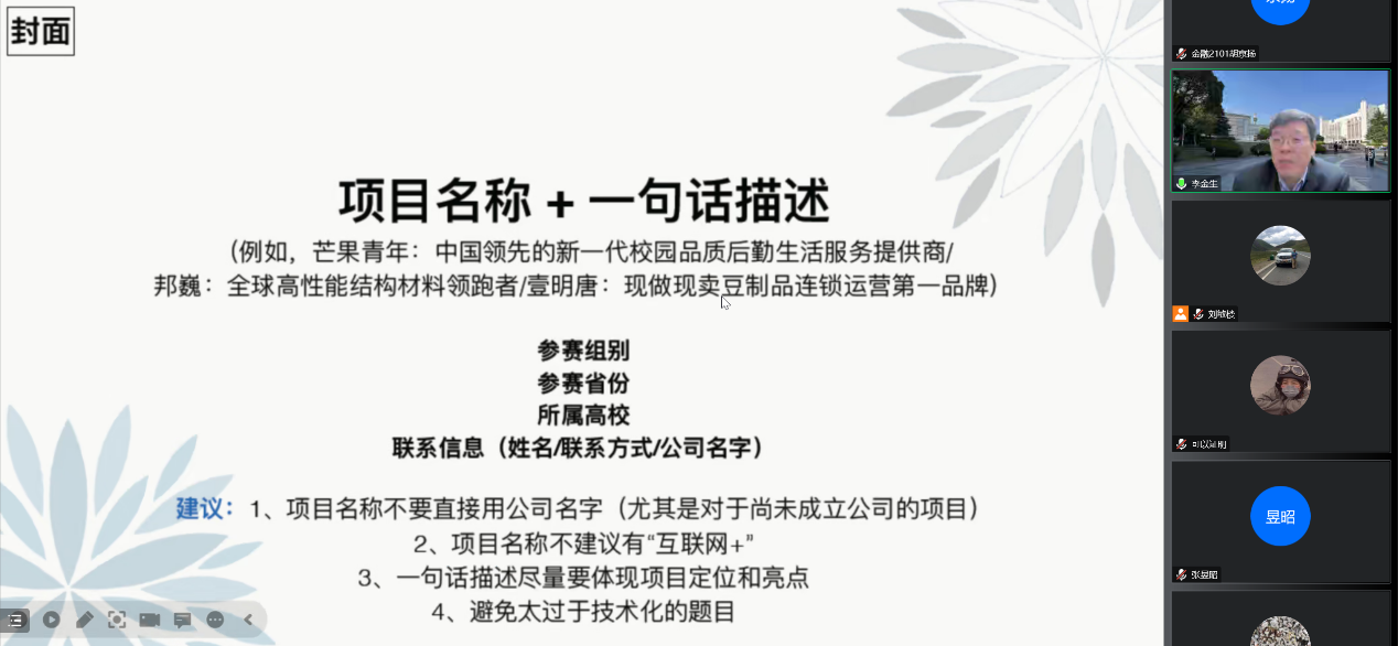 本次会议采用腾讯会议的形式召开,邀请了南京师范大学商学院教授、博士生导师李金生老师进行线上分享。李老师曾指导学生团队获得全国大学生“挑战杯”创业策划大赛金奖和银奖10余项,拥有丰富的竞赛经验。指导会上,李老师结合生动有趣的案例,从全国大学生互联网+创新创业大赛的主要赛道、评审规则、大赛项目书的核心要点、路演PPT的撰写等六个方面对大学生“互联网+”比赛进行了深入浅出的讲解,深度挖掘了“互联网+”比赛的实质,为在线师生提出了很多切实可行的备赛建议。