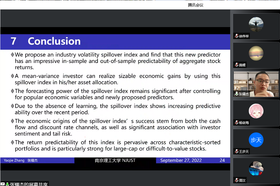9月27日,应金融学院邀请,南京理工大学经济管理学院张耀杰副教授在腾讯会议线上作了题为“Industry Volatility and Spillover and Aggregate Stock Returns”的讲座。学院部分青年教师及研究生参与了本次讲座,讲座由金融学院金融系主任莫媛副教授主持。讲座开始,金融学院院长张成对张耀杰副教授的到来表示热烈欢迎。