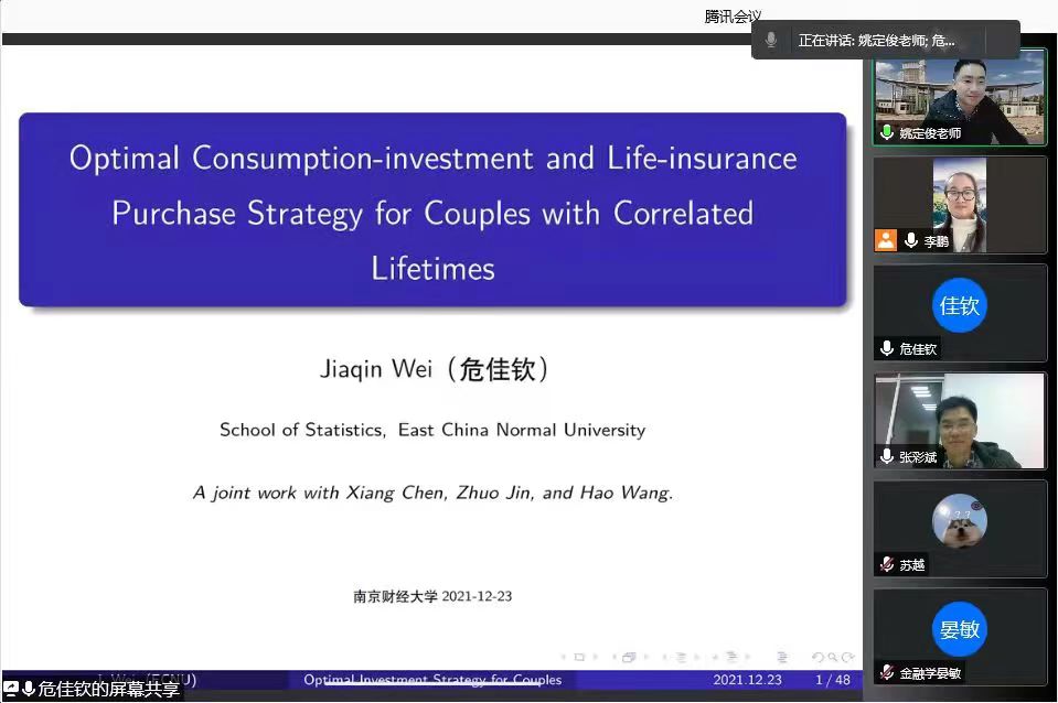 12月23日下午,应金融学院邀请,华东师范大学经管学部博士生导师危佳钦教授作了题为“Optimal Consumption-investment and Life-insurance Purchase Strategy for Couples with Correlated Lifetimes”的学术讲座。讲座由副院长姚定俊主持,金融学院部分教师和研究生聆听了本次讲座。