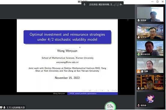 2022年11月15日下午,应金融学院邀请,厦门大学博士生导师王文元教授通过腾讯会议做了题为“Optimal investment and reinsurance strategies under 4/2 stochastic volatility model”的学术讲座。讲座由金融学院副院长姚定俊教授主持,金融学院部分青年教师和研究生聆听了此次讲座。