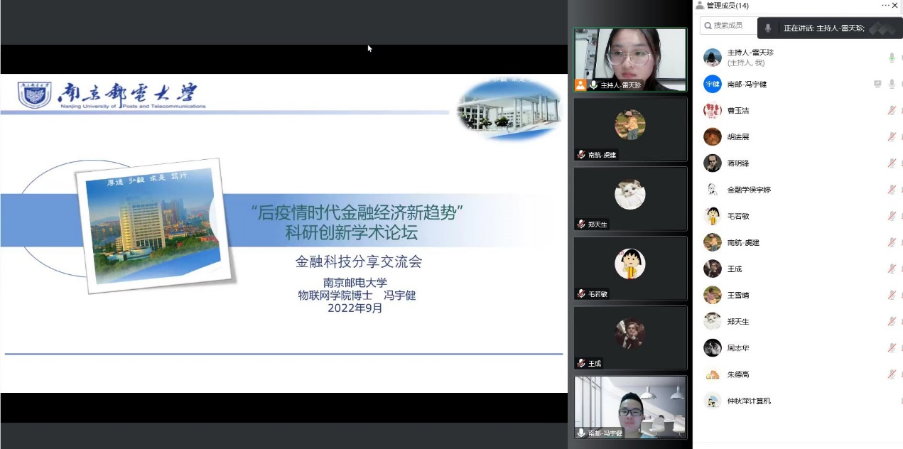 9月16日晚,直播性爱 举办“后疫情时代金融科技的发展”线上分享会,会议邀请了南京邮电大学冯宇健、南京航空航天大学虞建两位博士做专题讲座。两位博士阐述了当前计算机技术在金融领域的应用情况,分析了利用计算机技术推动后疫情时代下金融发展的可能性,为同学们的研究方向提供了新的思路。