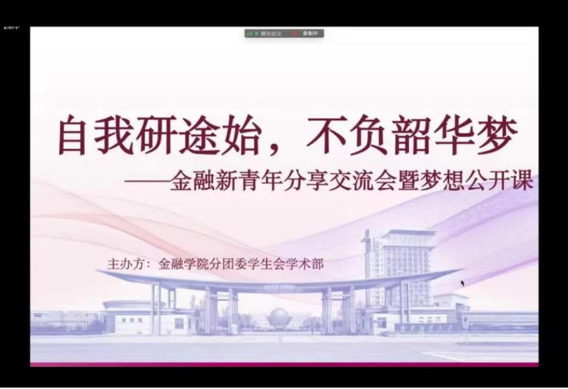 时入五月,又将是一年考研季。为解答同学们对于考研的迷惘与困惑、分享上岸学长学姐的成功经验,5月15日下午5点,金融学院在线上举办自我研途始,不负韶华梦——金融新青年分享交流会暨梦想公开课。姜耀、孙鼎立、钱思彤、王子净等四位优秀学长学姐应邀出席,部分大一大二大三的同学参加了此次活动。