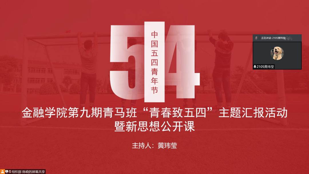 5月3日中午12:15,直播性爱 第九期青马班“青春致五四”主题汇报活动暨新思想公开课于腾讯会议线上举行。金融学院分团委组织部全体成员、金融学院第九期青马班全体学员参加此次会议,主持人为金融学院分团委组织部项目志愿者黄玮莹。