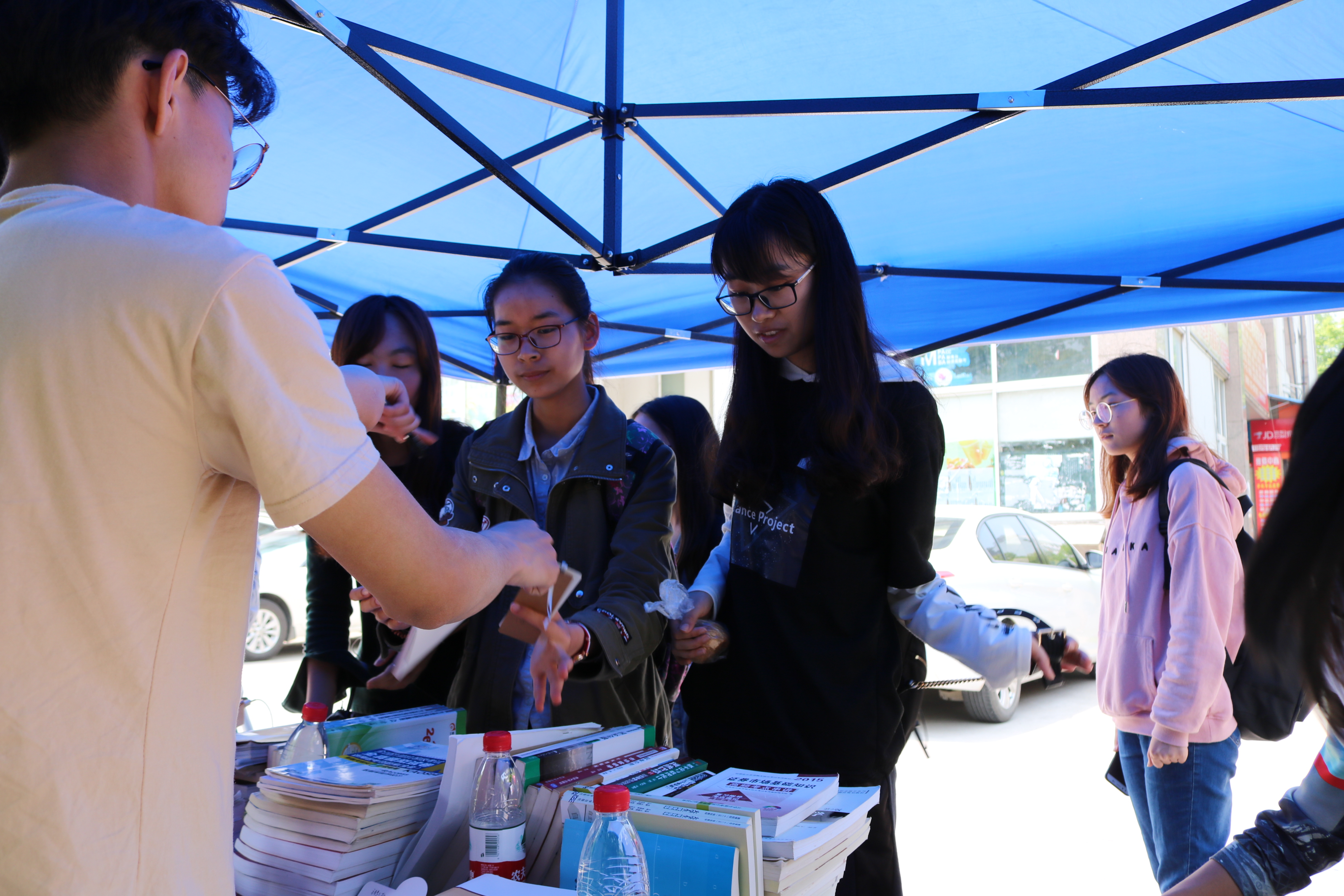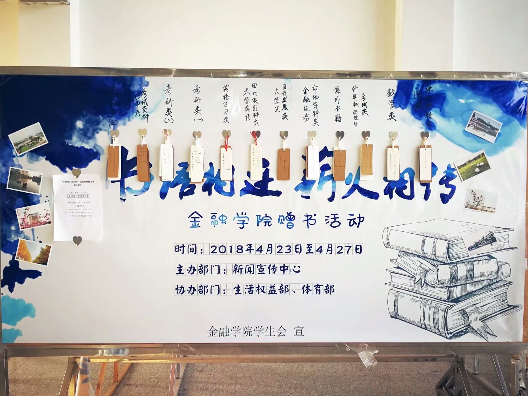 4月23至24日,金融学院学生会成员走访各个宿管站,将收集到的书籍分门别类,再根据书名制作书签,并在背面标上序号,以便参与抽奖。