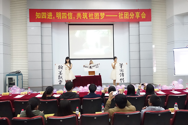 分享会在金属公社的《歌曲串烧》中拉开序幕,伴着萨克斯和电子琴流淌出的欢快轻盈的音符,浓浓的中国情从几位同学的歌曲声中散发出来,让整个会场都弥漫着身为中国人的骄傲与自豪。接下来融煜剧社的小品《以貌取人》以欢快的口吻阐释了了以貌取人的错误观念;扬子文学社的诗朗诵《当你老了》深情款款地讲述了关于理想,关于感动,关于奋斗的情怀;知行学社的书法表演《笔尖传情,翰墨飘香》用笔墨与宣纸的相遇诠释了一场关于文化的故事,就像微信墙上的那句“荆绒为心,知行合一”。接下来的有奖互动环节,同学们与主持人积极互动,那些关于四进 四信的题目完全就难不倒同学们,这将分享会的氛围推向一个高潮。