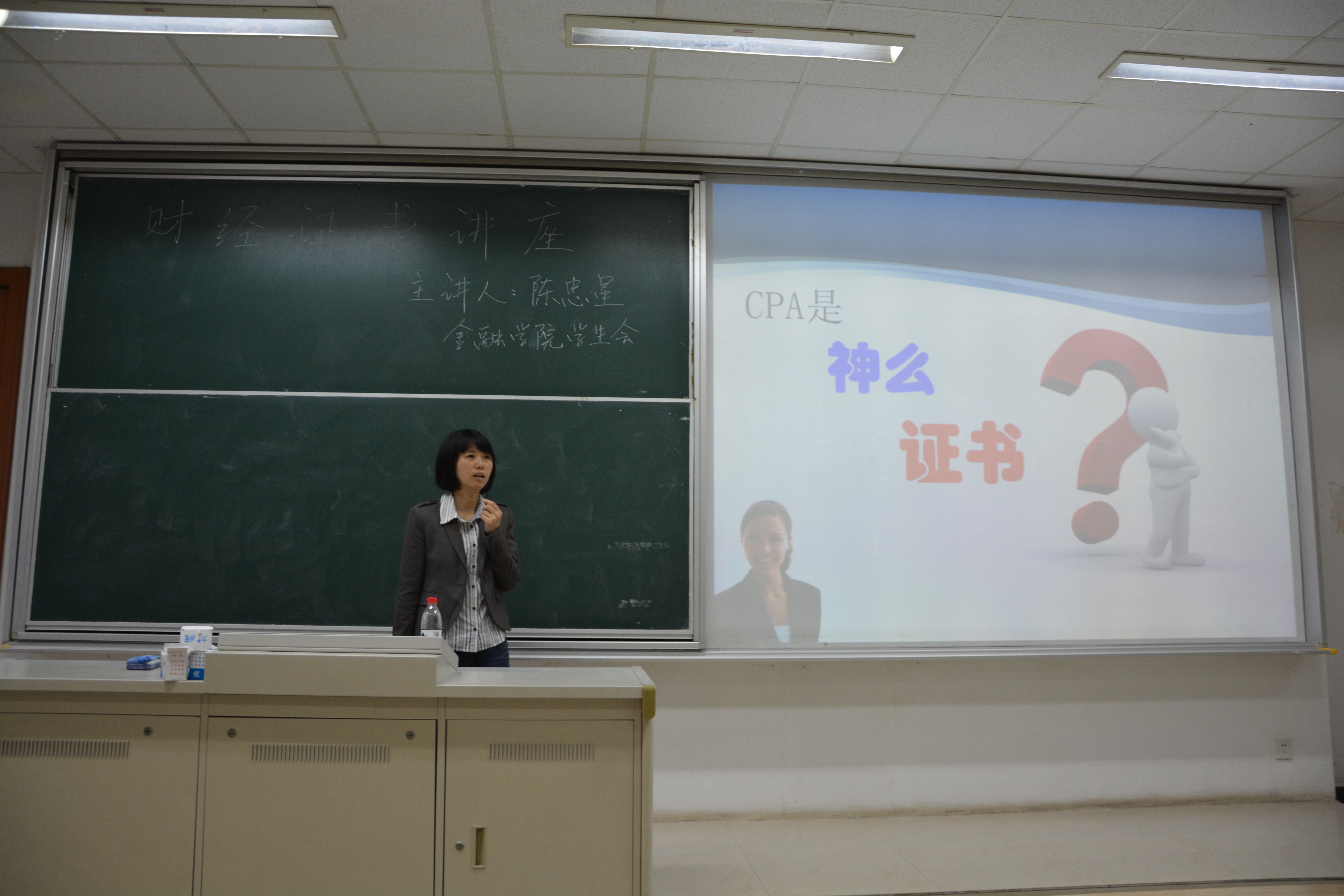 5月24日晚六点半,由金融学院学生会主办的财经证书讲座在教C103准时举行,此次讲座邀请到了有十年注会培训经验、国家高级注册会计师陈忠星女士作为此次的主讲人,并为我们讲解CPA、CFA证书的有效获取方法。