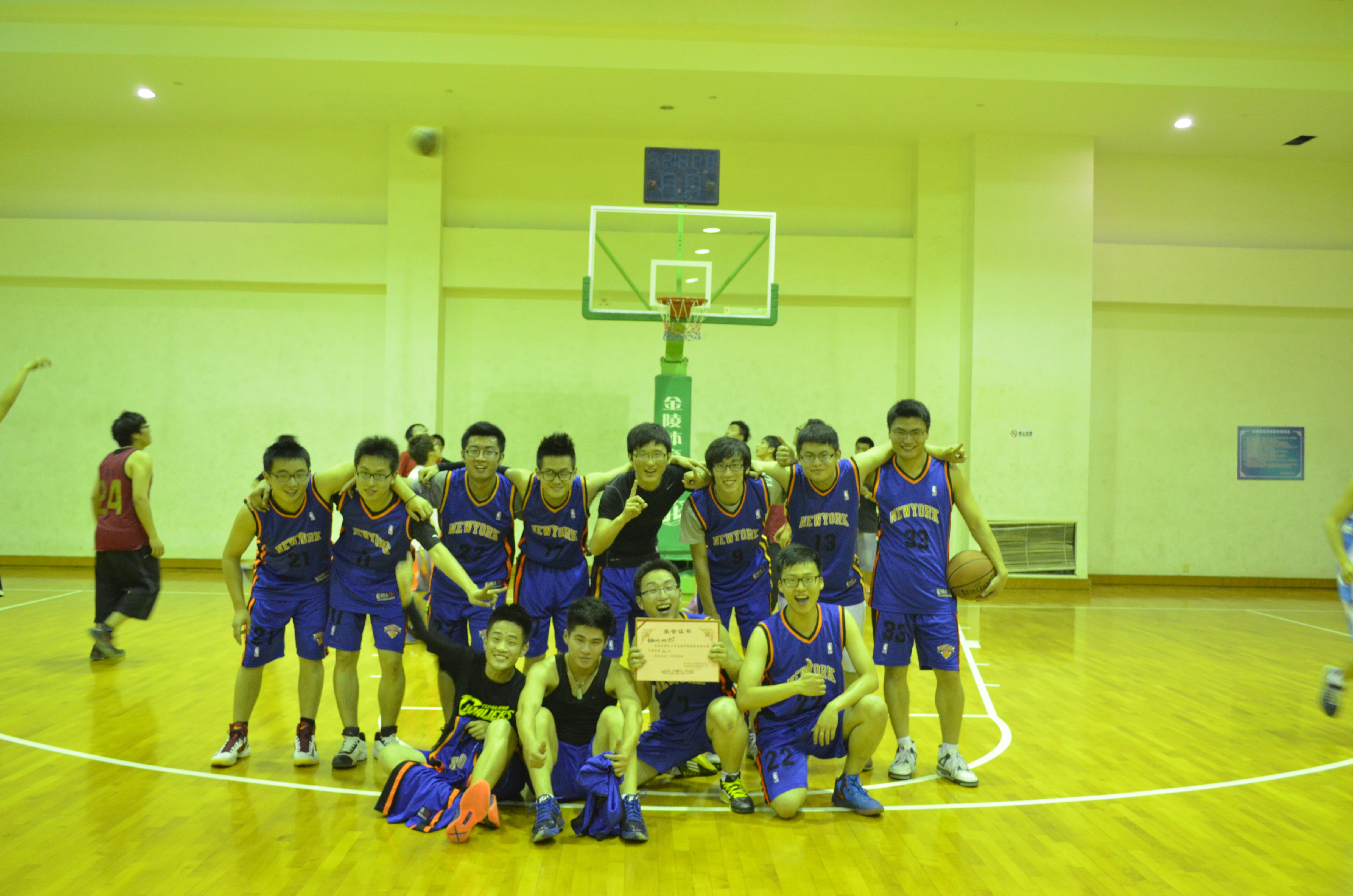 在三四名决赛后,是更令人期待的冠军争夺赛。由金工1103、1106队对阵金融1201、金工1201、1202队。上半场中,大二金工队凭借巧妙的传球,默契的配合占领了优势地位。至中场,大一队仍以15分差距落后。但在下半场中,大一队重整士气,打出几次精彩的防守反击,慢慢将比分拉近。在比赛结束前10分钟时,大一队连续的三个3分球更是引来了满堂喝彩。最终以金工1103、1106队以46:39战胜金融1201、金工1201、1202队夺得冠军。