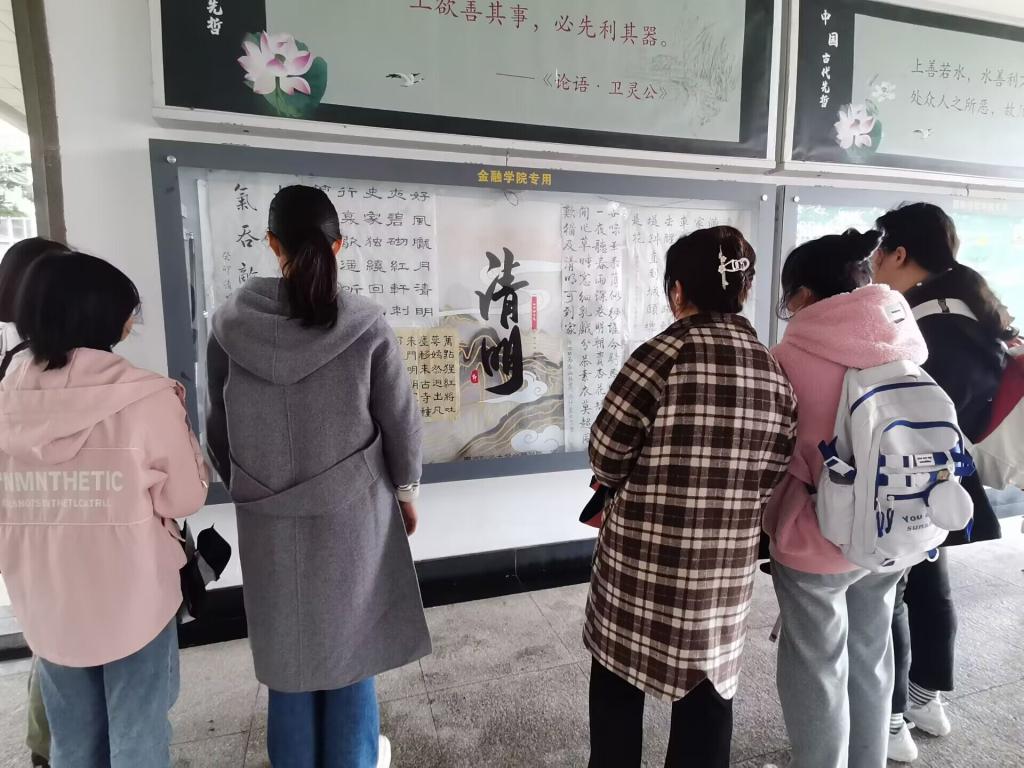 山水同在,日月共存,是为清明。金融学院长期注重学生素质发展工作,鼓励金融学子们学习专业知识的同时,提高理想信念与文化修养。未来,金融学院还将继续开展多层次活动,立民族文化之根,铸民族精神之魂,拓文明发展之道,用真理力量发展古老文明,用文化之火照亮民族复兴之路。