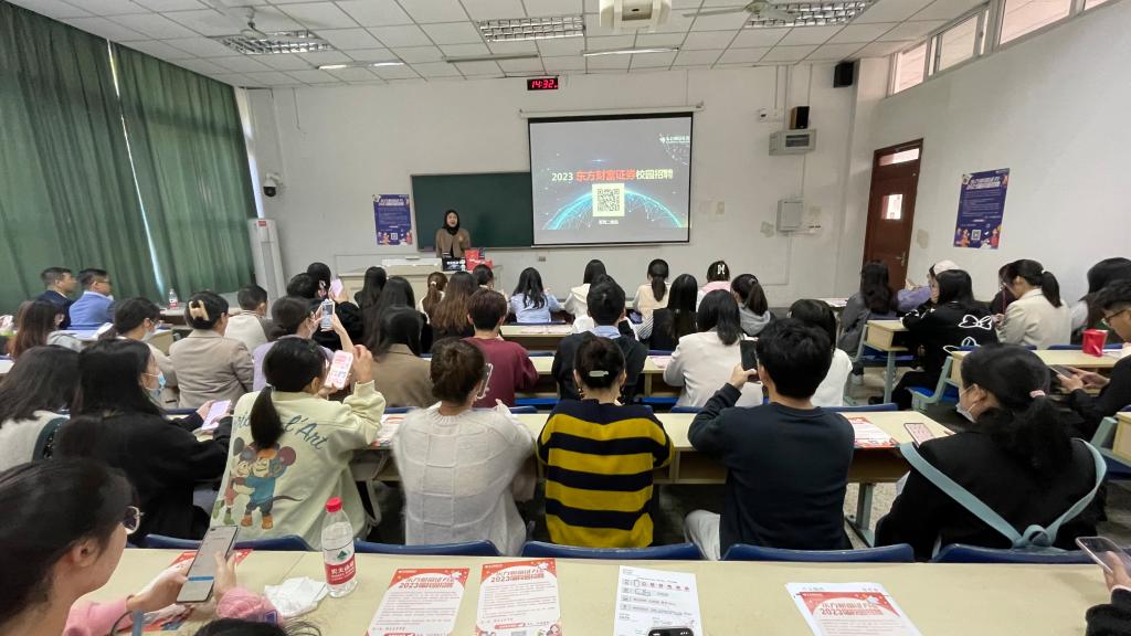 10月13日下午两点三十分,由东方财富信息股份有限公司主办,我校金融学院承办的“东方财富证券2023届校园招聘”专场宣讲招聘会在我校德经楼110教室举办。