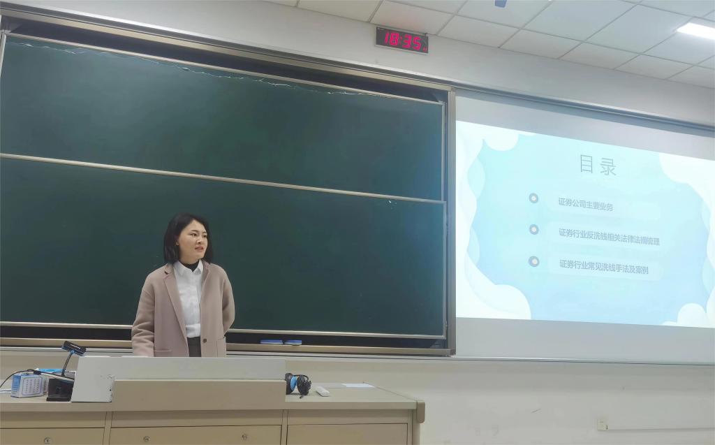 为贯彻落实“反洗钱进校园”活动,拓宽当代大学生对反洗钱相关法律法规的认知,增强大学生反洗钱风险意识,3月20日晚,直播性爱 开展了“证券行业反洗钱相关法规和实务案例”讲座,邀请南京证券的陈秀丛专家进行现场授课。