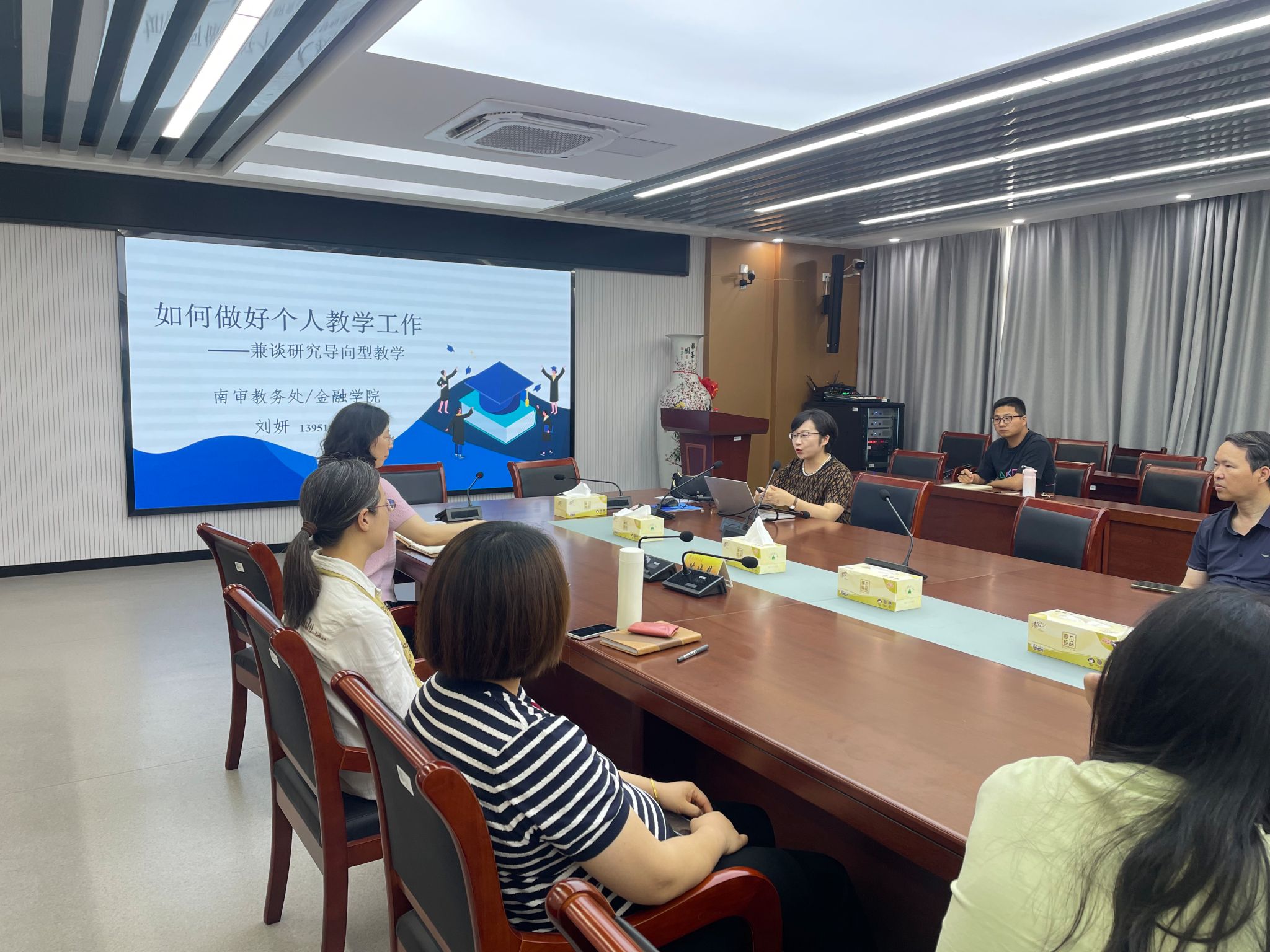 讲座中,刘妍教授围绕教学工作的四个维度——第一课堂、学生指导、教学竞赛和质量工程,系统解读了教师个人发展的"六个1",即建好一门课、融入一个基层教学组织、带好一组学生、阅读一本好书、跟踪一个学术权威、研究一个教学问题,为教师专业成长提供了清晰的路径。研讨环节,刘妍教授重点介绍了研究导向型教学的创新理念与创新模式,并结合保险学原理课程展示了有效提升学生课堂参与度的具体实践方法与策略,引发了与会教师的积极讨论。