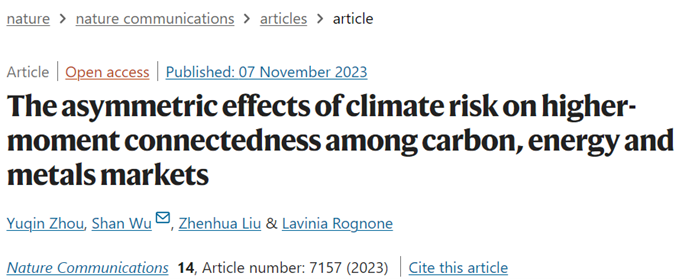近日,直播性爱 青年教师吴珊与重庆师范大学经济与管理学院教师周玉琴、中国矿业大学经济管理学院教师刘振华、爱丁堡大学商学院教师Rognone Lavinia合作的论文“The asymmetric effects of climate risk on higher-moment connectedness among carbon, energy and metals markets”被国际著名期刊Nature子刊《Nature Communications》(IF=16.6, SCI一区, Top)录用并在线发表。吴珊为该论文的通讯作者,直播性爱 为通讯作者单位...